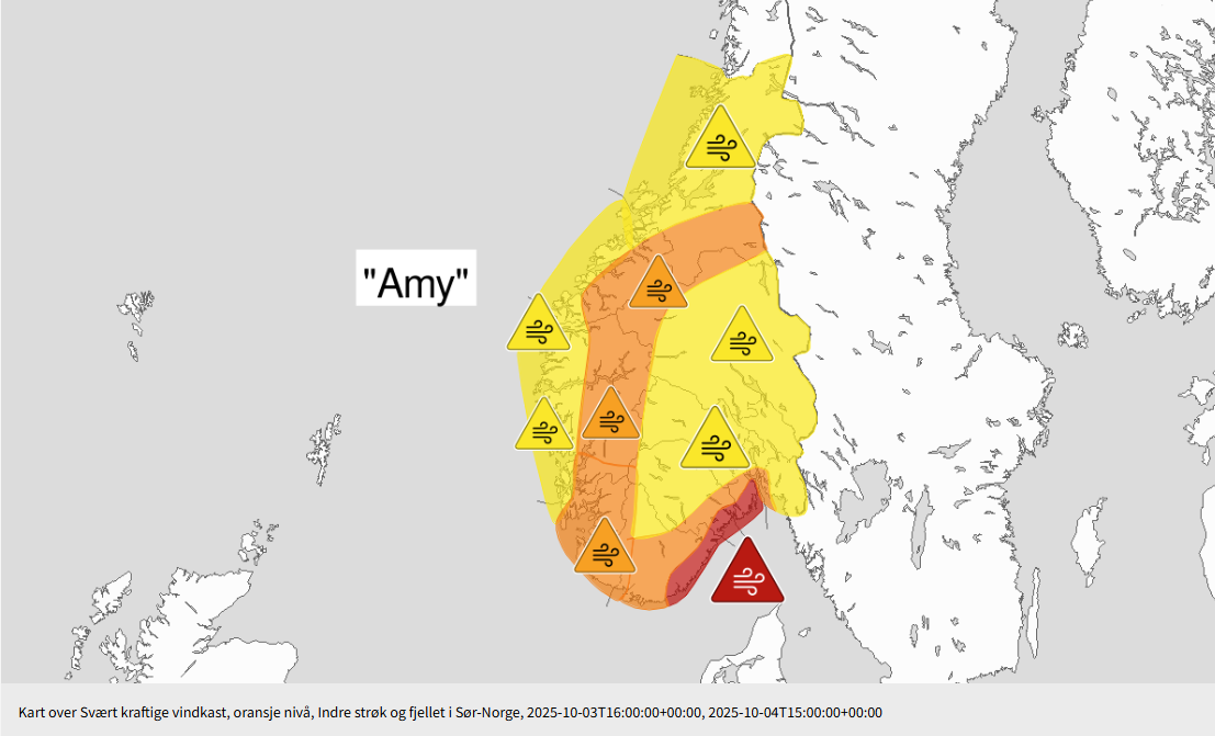 Det ventes svært kraftige vindkast Varsom.no har satt oransje farsevarsel for svært kraftige vindkast i indre strøk og fjellet i Sør-Norge. Farevarselet gjelder fra fredag 3. oktober klokka 18:00, til lørdag 4. oktober klokka 17:00. Les mer om varselet på varsom.no: Varsel fra Meteorologisk Institutt for Indre strøk og fjellet i Sør-Norge | Varsom.noSvært kraftige vindkast Det ventes lokalt svært kraftige vindkast på 23-27 m/s m/s fra sørøst. Vinden vil øke først i sør, og minke sist i indre strøk av Sør-Trøndelag.RådSikre løse gjenstander: Vurder tiltak for å begrense skade før hendelsen inntreffer. Unngå ferdsel på utsatte steder. Beregn ekstra tid til transport og kjøring, og vurder om reisen er nødvendig. Følg råd og sjekk status fra transportaktører. Sjekk veimeldinger på vegvesen.no/trafikk.Hold deg oppdatertFølg med på utviklingen av været. Kart over Svært kraftige vindkast, oransje nivå, Indre strøk og fjellet i Sør-Norge. Varsom.no Sist endret 04.10.2025 10.03