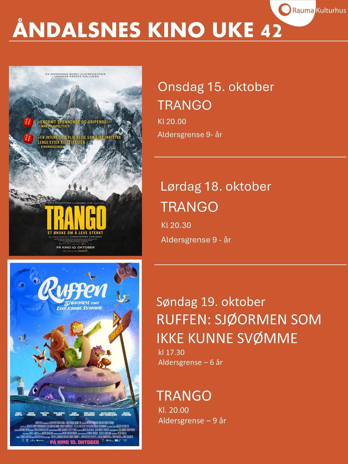 Kinoen åpner igjen onsdag 15. oktoberVelkommen tilbake til kinoenDenne uken vises to filmer: Trango og Ruffen.Kjøp billetter her Sist endret 14.10.2025 15.59