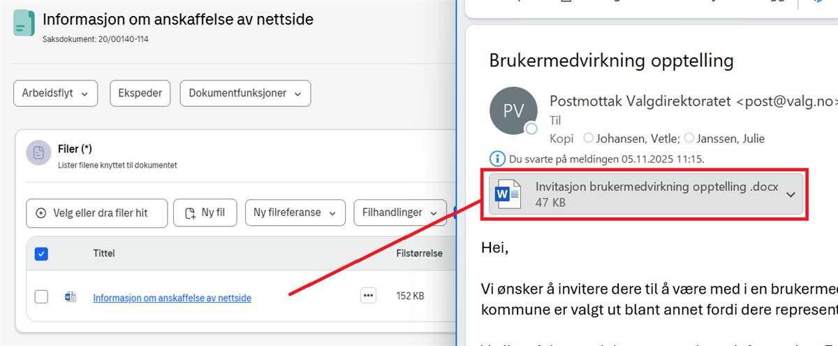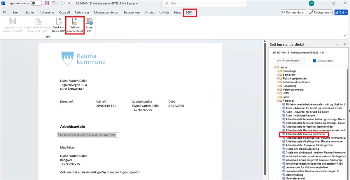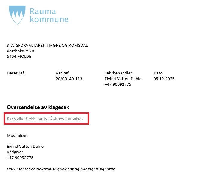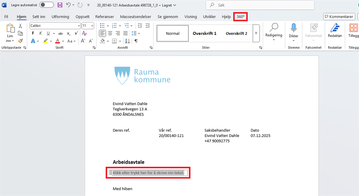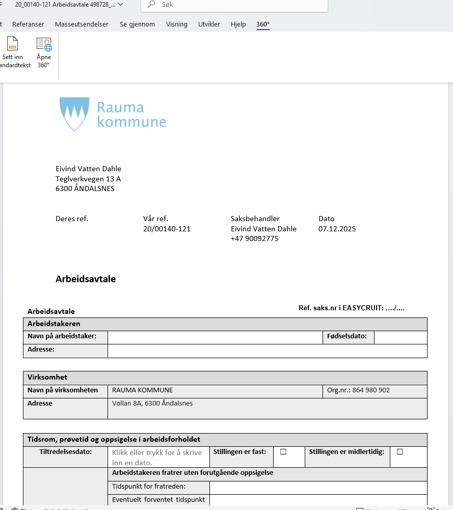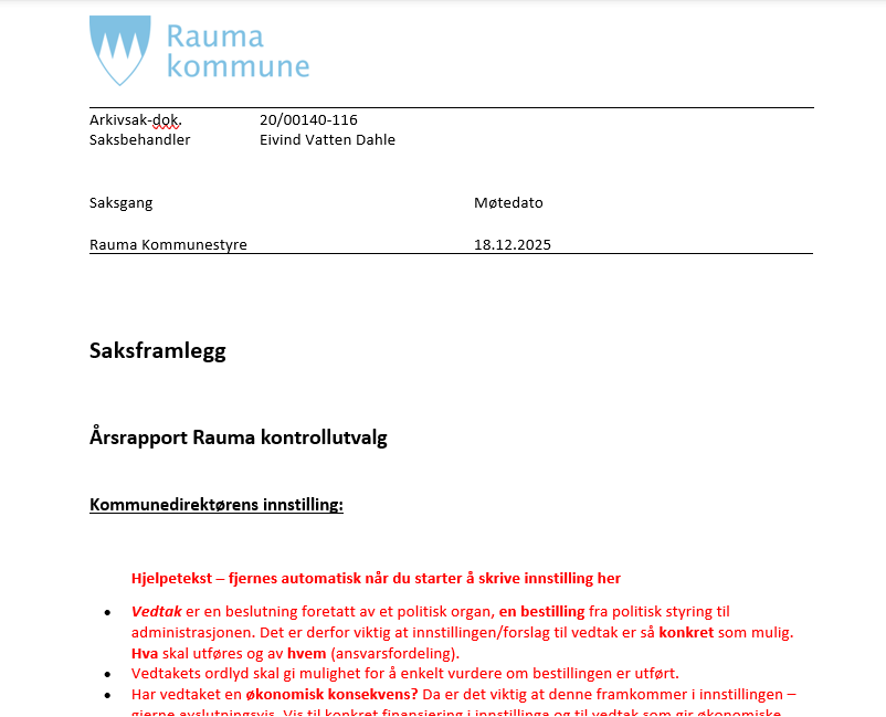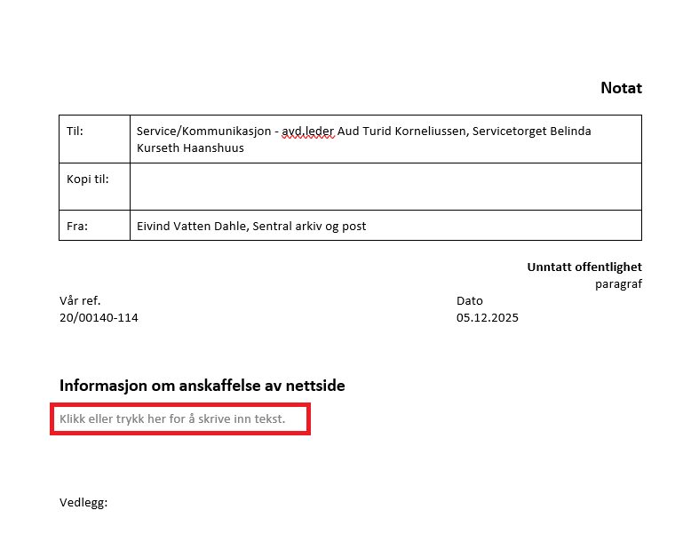 Nå produseres det en Word-mal, der relevante metadata automatisk er fylt inn, som dokumentnummer (vår ref.) og dokumentdato. I malen skriver du inn tekst (eller bruker funksjonen standardtekst). Malen kan lukkes og åpnes/redigeres igjen frem til den blir ekspedert.