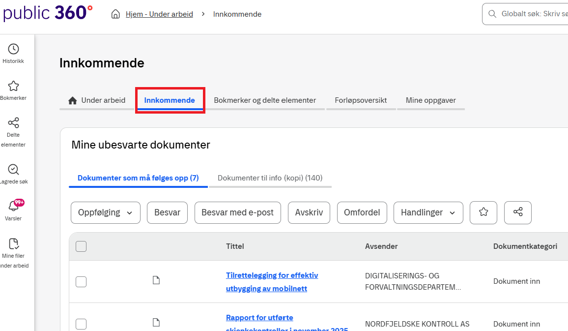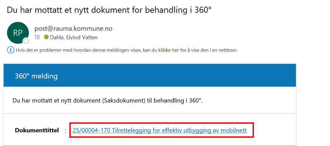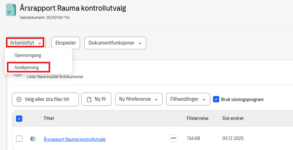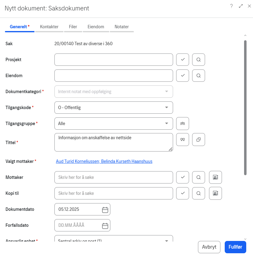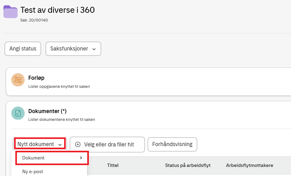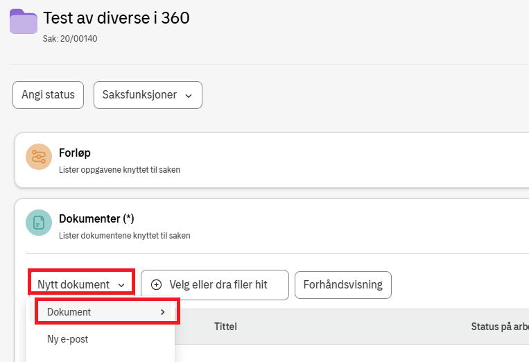 I dette eksempel brukes en saksmappe med tittel Test av diverse i 360 og saksnummer 20/00140.