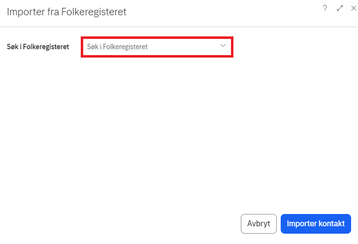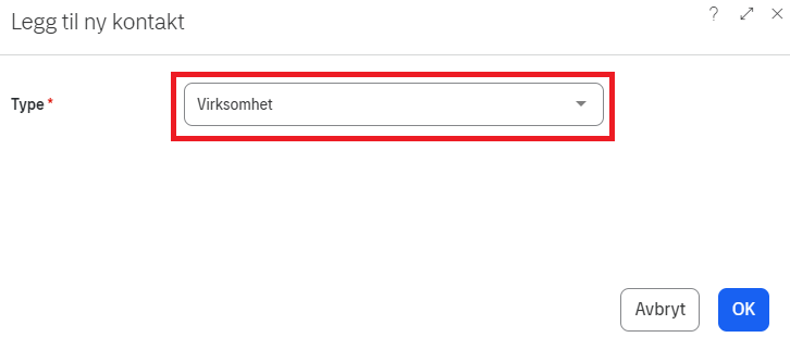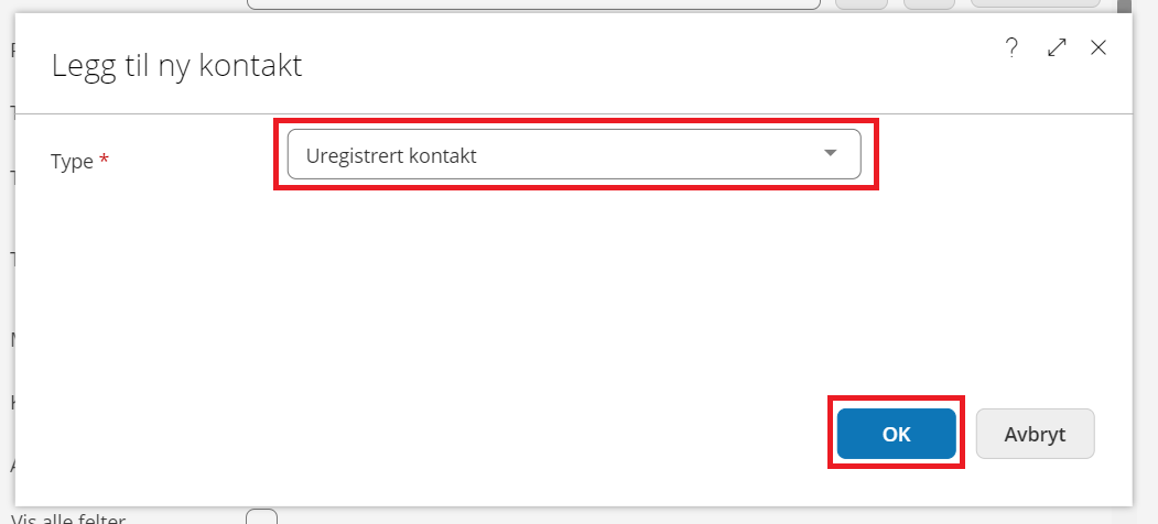 Men skulle det være behov for å registrere en ny kontakt, klikker du på knappen Ny kontakt. Deretter må du velge hvilken type kontakt du skal opprette. Du kan velge mellom kontaktperson, privatperson, virksomhet eller uregistrert kontakt:
