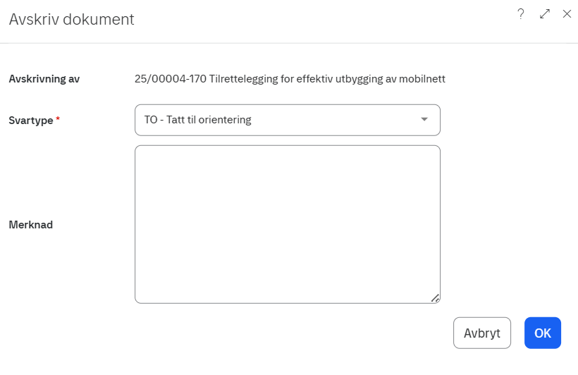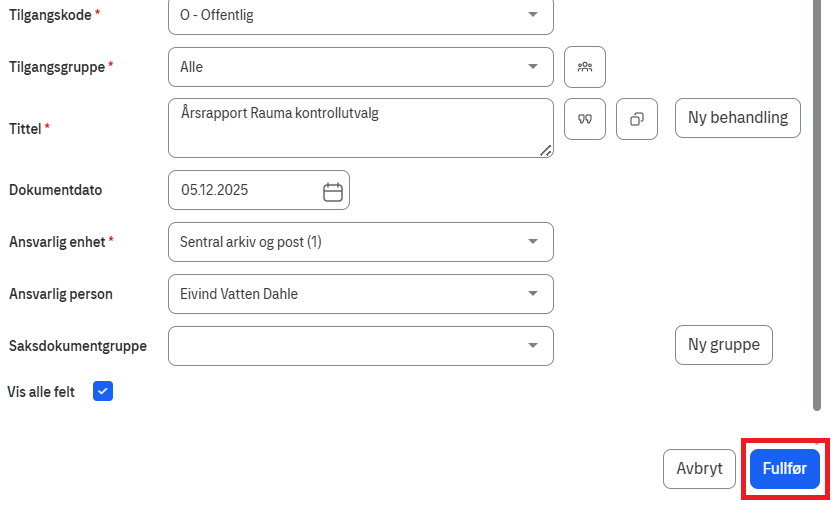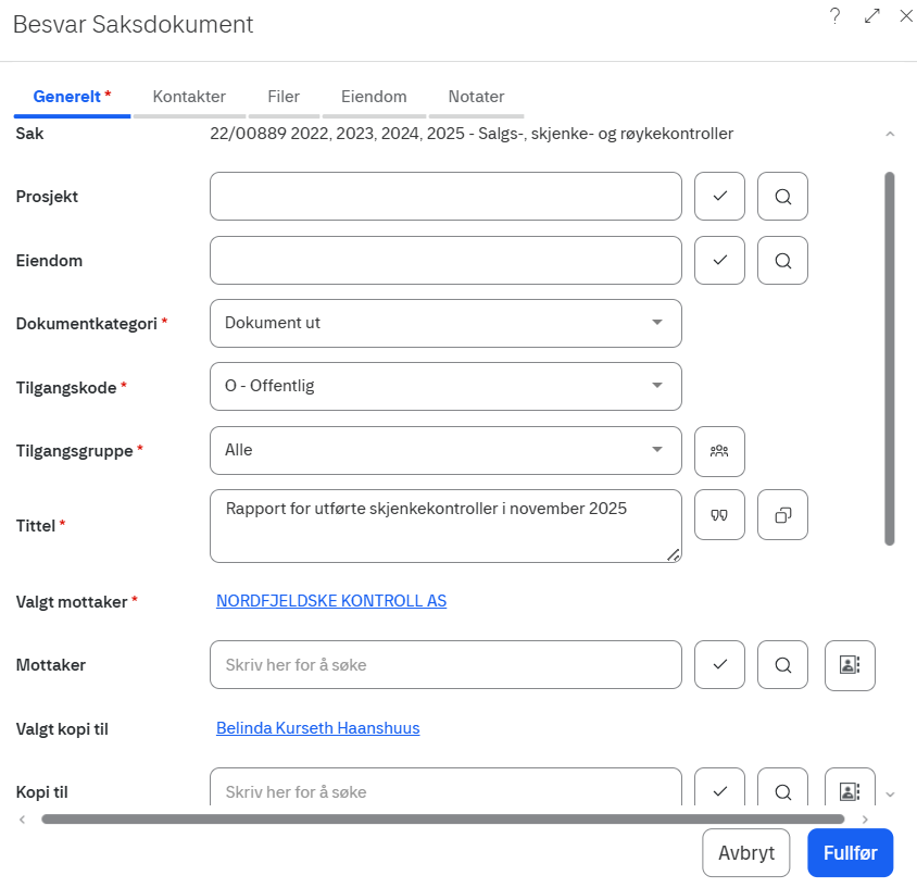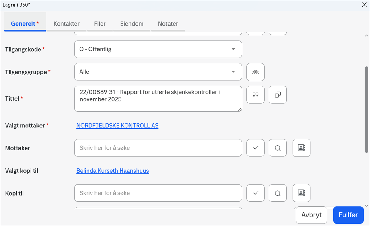 Du må gjøre en vurdering av om dokumentet skal være offentlig og om tilgangsgruppen er riktig, og du må lage en god dokumenttittel og legge inn mottaker.