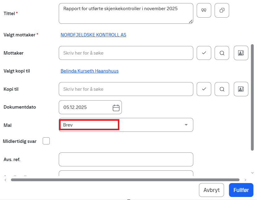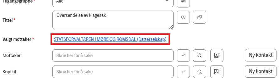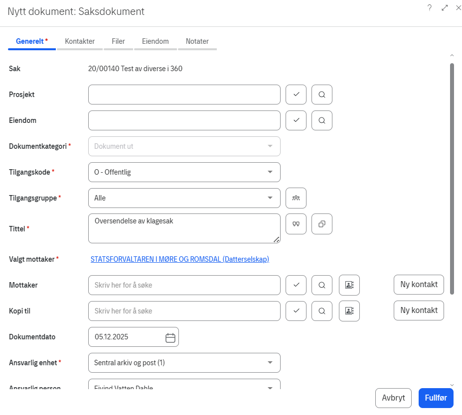 I dette eksempelet har dokumentet fått tittelen Oversendelse av klagesak, og mottaker er Statsforvaltaren i Møre og Romsdal. Når tittel og mottaker(e) er lagt inn, klikk på Fullfør for å opprette brevmalen: