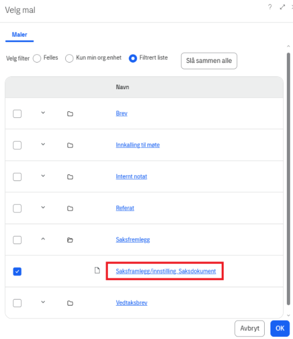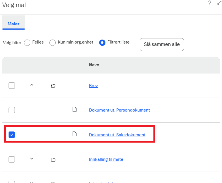 Du kan opprette et utgående dokument fra hamburgermenyen i høyre hjørne, men det anbefales å heller gjøre det direkte fra en sak. Det betyr at du bruker en saksmappe som allerede er opprettet, eller oppretter en ny saksmappe.