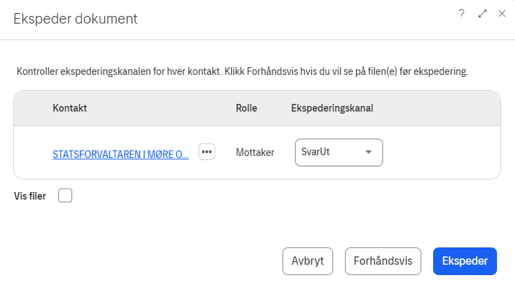 I neste bilde kontrollerer du ekspederingskanalen før endelig ekspedering. Som standard velges SvarUt når mottakeren er registrert med organisasjonsnummer/personnummer; det betyr at mottaker vil få brevet i sin digitale innboks (f. eks Digipost eller Altinn).