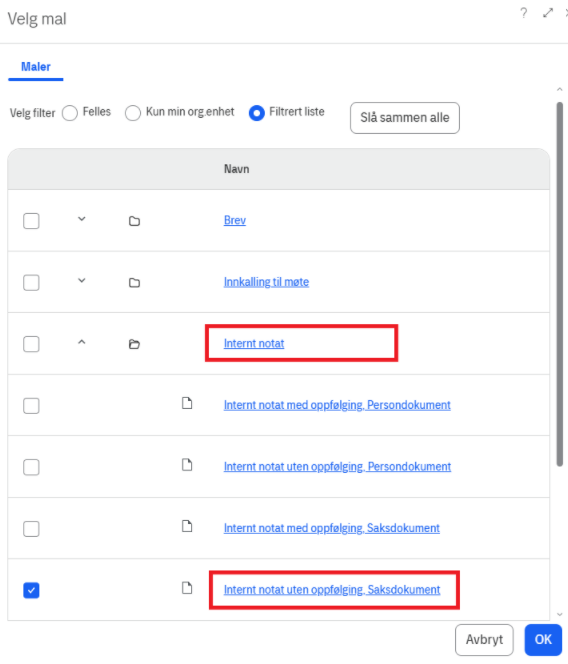 Husk at denne malen aldri skal lagres, men du klikker på krysset i høyre hjørne for å lukke den. Malen blir automatisk lagret: