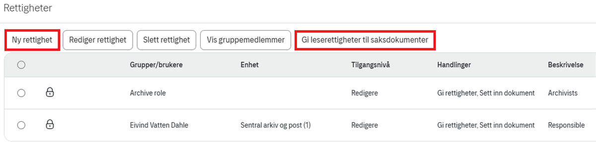 I rettighetsmatrisen kan du se hvem som allerede har rettigheter, hva de har rettigheter til, og hvilken rolle rettighetene er knyttet til. Rettigheter som er gitt automatisk symboliseres med et hengelåssymbol, og disse rettighetene kan ikke endres/slettes.
