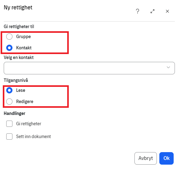 Du velger først om du vil rettigheter til en gruppe (dvs. tilgangsgruppe) eller en kontakt (dvs. enkeltperson). Deretter velger du om gruppen eller kontakten kun skal ha lesetilgang eller tilgang til å redigere.
