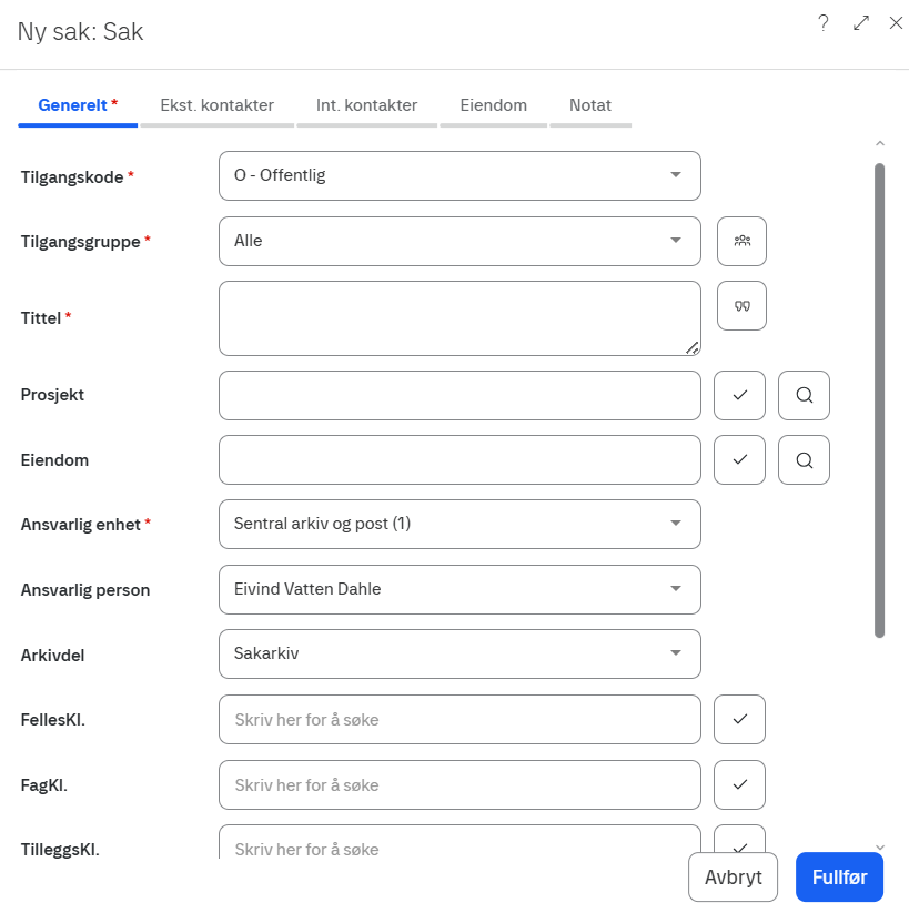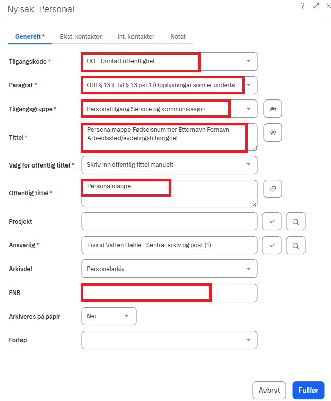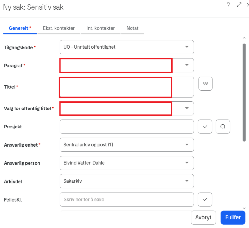 I sakstypen Sensitiv sak er det påkrevd å velge tilgangskoden UO - Unntatt offentlighet. Du må deretter velge en relevant paragraf som hjemmel for å unnta innholdet fra offentlighet. Deretter gir du saken en tittel og tar stilling til om den offentlige tittelen skal være den samme, eller om du skal lage en annen offentlig tittel. Når dette er gjort, kan du klikke på Fullfør for å opprette saken: