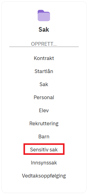 Noen ganger kan det være behov for å opprette en sensitiv sak i P360. Formålet med en sensitiv sak er å begrense tilgangen til saken, ved at det ikke er mulig å velge tilgangsgruppe. I utgangspunktet vil da kun personen som oppretter saken og er ansvarlig for den, ha tilgang. Andre personer må spesifikt gis tilgang.