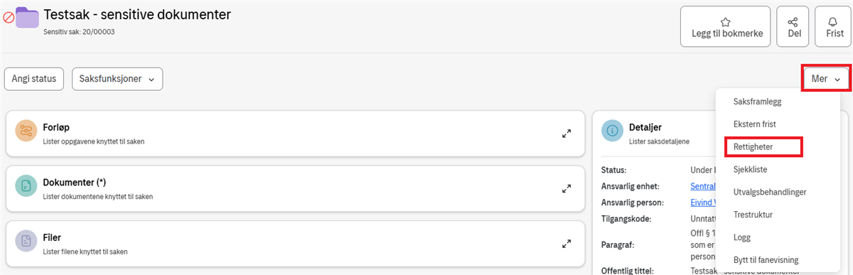 Rettigheter til selve saken eller til enkelte saksdokumenter, gir du ved å klikke på knappen Mer til høyre i bildet og på Rettigheter: