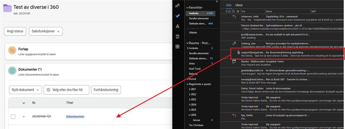 For å arkivere en e-post må du ha en saksmappe å arkivere den i. I eksempelet her brukes mappen Test av diverse i 360 med saksnummer 20/00140.