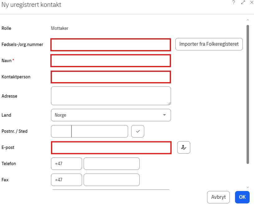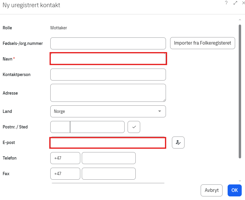 I neste bilde er det obligatorisk å fylle ut feltene som har en rød stjerne.