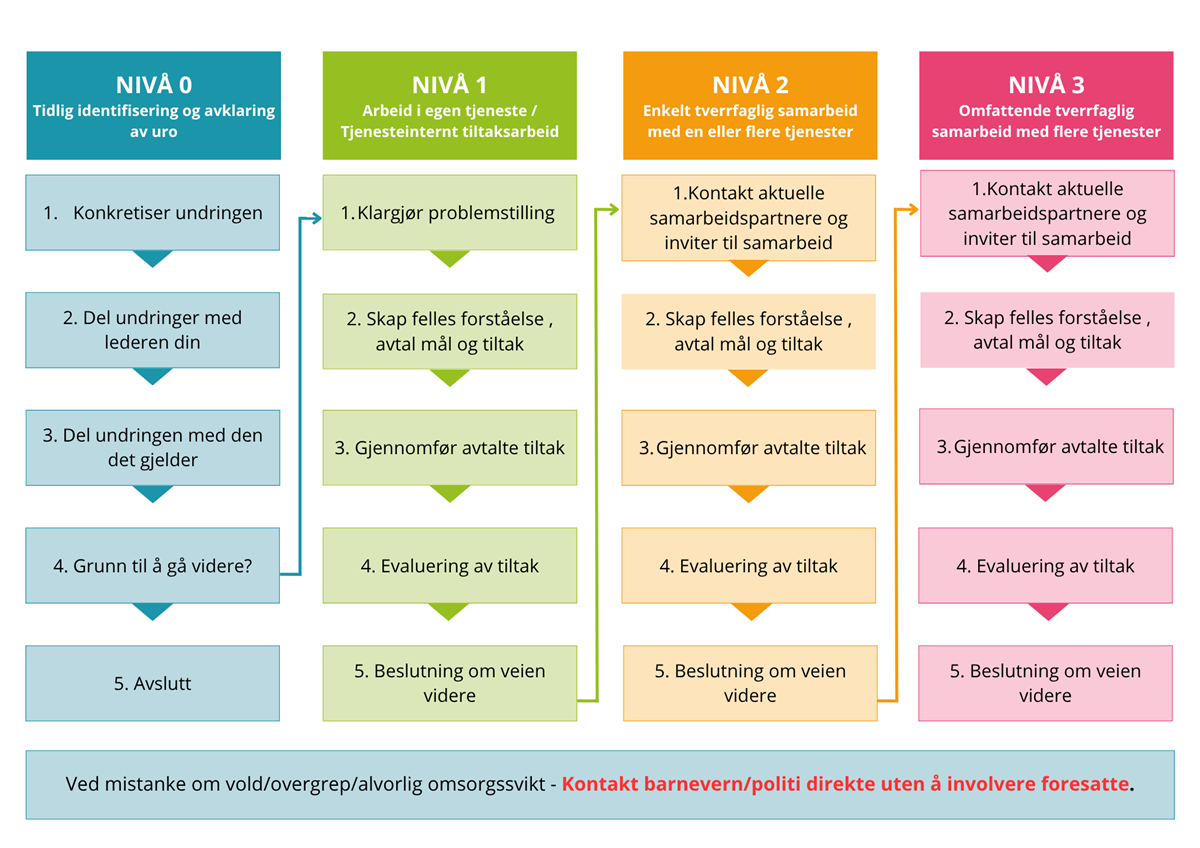 HandlingsveilederSiden er under arbeid. OBS UTKAST kun ment for illustrasjon av saksgang Mistanke om vold/overgrep/alvorlig omsorgssvikt?Ta direkte kontakt med Politi (112) eller Barnevernstjenesten (x). Her kan fagfolk og foresatte se hvordan ansatte skal gå fram i arbeidet med barn, unge eller familier man har en undring eller bekymring for. Nivå 0: Tidlig identifisering og avklaring av uroHensikten med arbeidet på nivå 0 er å identifisere tidlig barn som kan ha behov for ekstra innsats gjennom å sette ord på det som skaper undring eller bekymring, og avklare med barnet og de foresatte om det er behov for handling. Dette er avklaringsfasen for fagpersoner, og den det gjelder skal involveres så tidlig som mulig. 0. Undringen oppstårDu starter å undre deg over et barns/en ungdoms/en gravids/ en families trivsel, helse, utvikling, samspill eller livssituasjon. Hvordan?I møte med den det gjelder, eller på bakgrunn av informasjon fra andre.Husk at bare du eier din undring – den er subjektiv og et viktig verktøy.Hvem?Alle medarbeidere.VerktøyKjennetegn på at barn og unge har det braObservasjonspunkter å være oppmerksom på hos barn/unge som vekker undring eller bekymring 1. Konkretiser undringenKonkretiser undringen eller bekymringen for deg selv. Ved behov, drøft med en kollega.Hvordan?Skriv ned observasjoner, situasjoner, informasjon og handlinger som leder til undring, bekymring eller spørsmål vedrørende individets trivsel, helse, utvikling, samspill eller livssituasjon. Vær så konkret som mulig.Del din undring og dine observasjoner med en leder/kollega. Det kan hjelpe deg i konkretiseringen. Husk at du eier uroen selv om andre kanskje ikke er enig med deg.Ved mistanke om vold og overgrep mot barn:Husk at alle som arbeider med barn har ansvar for at de har det bra. Har du mistanke om at et barn blir utsatt for vold eller overgrep kan du være den eneste som kan tale barnet sin sak. TØRR DET!Ved mistanke om vold eller overgrep skal du ta direktekontakt med Politi (112), barnevernstjenesten (x) eller Barnevernvakta (976 01 616)Hvem?Medarbeideren som eier undringen.VerktøyUndringsnotatRisiko- og beskyttelsesfaktorer - en sjekklisteVed mistanke om vold mot barn kan dette flytskjemaet være til hjelp.Ved behov for mer kunnskap om Vold i nære relasjoner, se NKVTS – En veileder om vold i nære relasjoner2. Del undringen med lederen dinDel undringen din med nærmeste leder ved første anledning. Dersom saken skal tas videre, avgjør dere hvem som tar kontakt med den det gjelder / foresatte.Hvordan?xHvem?Medarbeideren som eier undringen.Verktøyx2. Del undringen med den/de det gjelderInviter og gjennomfør samtale med den det gjelder / foresatte senest 4 uker etter at uroen har oppstått.Der deler du undringen din på en respektfull måte, som opprettholder muligheten for videre samarbeid.Hovedregelen er at barn skal høres direkte, ikke via andre voksneNB! Ved mistanke om vold og overgrep mot barn:Husk at alle som arbeider med barn har ansvar for at de har det bra. Har du mistanke om at et barn blir utsatt for vold eller overgrep kan du være den eneste som kan tale barnet sin sak. TØRR DET!Ved mistanke om vold eller overgrep skal du ta direktekontakt med Politi (112), barnevernstjenesten (x) eller Barnevernvakta (976 01 616)Hvordan?Forbered deg på samtalenDrøft med en kollegaØv gjerne på samtalen sammen med en kollegaGjennomfør samtalenHvem?Medarbeider som eier undringen (evt. avklares i enkelte tjeneste).VerktøySamtalekart barn (PDF, 242 kB) (Eksempel)Anbefalte nettressurserBarnehage - Dialogmodellen og Skole - DialogmodellenBarn og unges rett til medvirkning (bufdir.no)Barnekonvensjonen i saksbehandlinga (udir.no)SNAKKE - lar deg øve på viktige samtaler med barn og ungdom3. Grunn til å gå videre?I samtalen med den det gjelder / foresatte blir det drøftet om det er grunn til å gå til videre oppfølging.Hvordan? (forslag 1)Dersom det er behov for å sette i gang tiltak i egen tjeneste/virksomhet, gå videre til Nivå 1: Arbeid i egen tjeneste / tjenesteinternt tiltaksarbeid i handlingsveilederen. NB! Også på Nivå 1 er det fullt mulig å søke råd og veiledning hos andre tjenester / avdelinger uten at det blir opprettet et tverrsektorielt samarbeid. Husk da å få samtykke fra den det gjelder / foresatte dersom saken ikke skal drøftes anonymt. Dersom det ikke er nødvendig å sette inn tiltak, avslutt saken.Er det behov for å hente inn ekstern hjelp utenfor gjeldende tjeneste, gå til Nivå 2: Enkelt tverrfaglig samarbeid med en eller flere tjenester. Husk å innhente samtykke fra den det gjelder / foresatte om å ta saken videre.Hvem?Medarbeider som eier undringen (evt. avklares i enkelte tjeneste).VerktøySamtykkeskjema (mer informasjon kommer)4. AvsluttDersom det ikke er grunnlag for videre oppfølging, lukker dere saken og arkiverer aktuelle dokumenter i aktuelt fagsystem.Hvordan?Følg egen tjenestes rutiner for å dokumentere.Takk de involverte for godt samarbeid.Minn den det gjelder / foresatte om at de er velkomne til å be om hjelp dersom det skulle oppstå nye vansker på et senere tidspunkt.Hvem?Medarbeider som eier undringen (evt. avklares i enkelte tjeneste). Nivå 1: Arbeid i egen tjeneste / tjenesteinternt tiltaksarbeidHensikten med nivå 1 er å etablere et godt samarbeid med barn, unge og foresatte og få en god struktur på innsatsen på eget arbeidssted. 1. Klargjør problemstillingGå gjennom grunnlagsmaterialet fra nivå 0. Definer problemstilling sammen med barnet/ungdommen/foresatte/den gravide.StøttespørsmålHva handler det om?Hva gjør at dette oppfattes som et problem?Mulige årsaker.Hva er viktig for deg/dere?Hva ønsker du/dere skal skje?HvemDen som eier undringer / evt. avtalt ansattVerktøyRisiko- og beskyttelsesfaktorer - en sjekkliste Samtykkeskjema2. Skap felles forståelse, avtal mål og tiltakEt helt sentralt utgangspunkt for tidlig innsats er at barn, ungdom, foresatte, gravide og fagpersoner har felles forstå